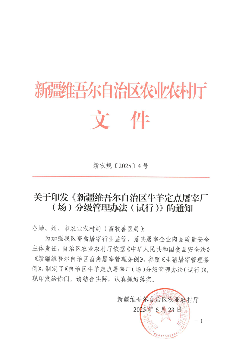 【本部门规范性文件】关于印发《新疆维吾尔自治区牛羊定点屠宰厂(场)分级管理办法(试行)》的通知
